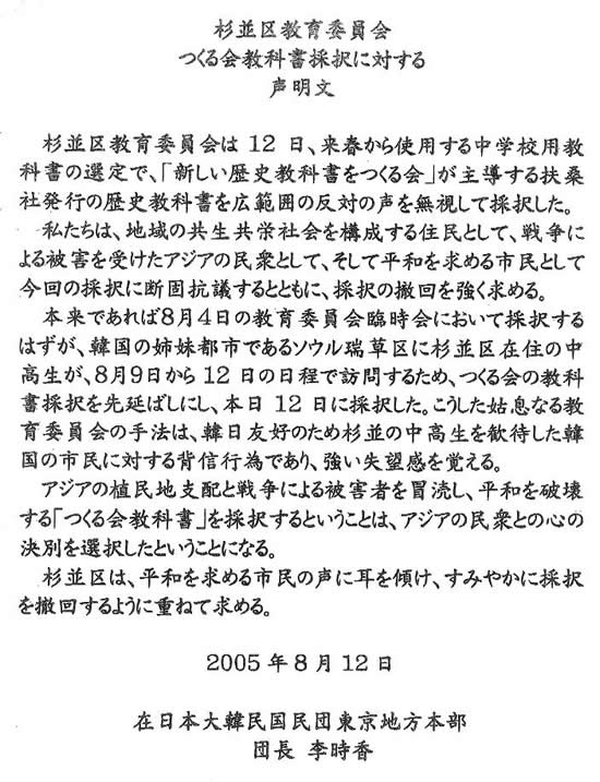 杉並区教育委員会のつくる会教科書採択に対する声明文