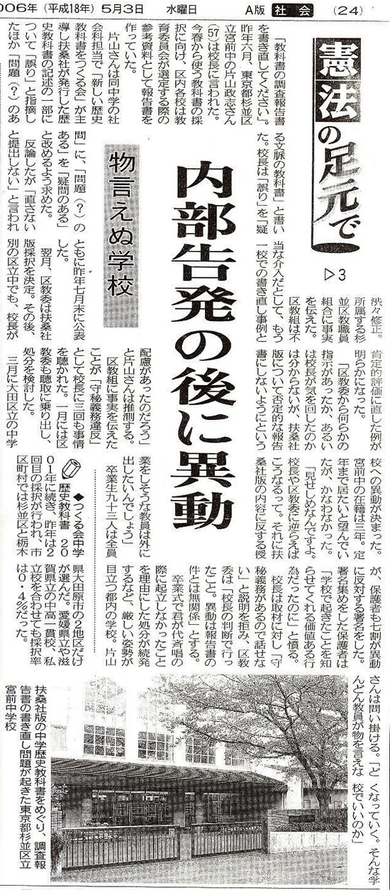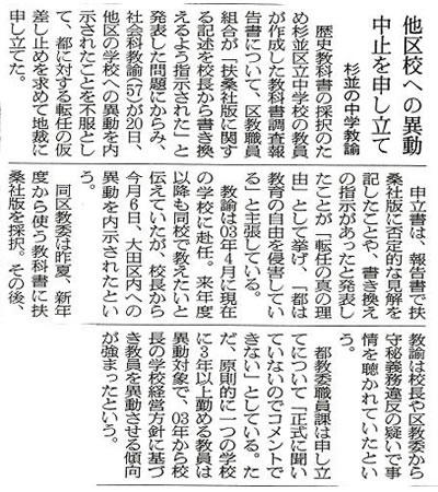 3月20日、「書き換え問題」で強制異動の内示を出された、宮前中片山政志さんが、東京地裁に「転任処分の差し止め請求訴訟」を提訴し、仮の差し止めを申し立てました。片山さんの強制異動に対しては、宮前中の保護者118名が賛同し、杉並区教育委員会、東京都教育委員会に撤回を要請しました。また、本日、卒業式後、子どもたちは自主的に署名を集め、3年生全員の署名を校長に提出したそうです。下は記者会見の様子です。