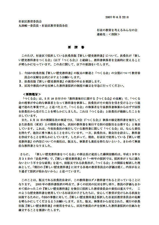 この度、杉並区の中学校で現在使われている『新しい歴史教科書』は、出版元である扶桑社自身が「右より過ぎ」であることを理由に継続出版をしないと明言し、その発行母体である「新しい歴史教科書をつくる会」(以下、つくる会)と絶縁関係となったことが明らかになりました。このことについて、私たちは以下のような公開質問状を提出いたしますので、速やかなご返答をお願いいたします。